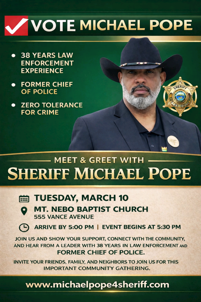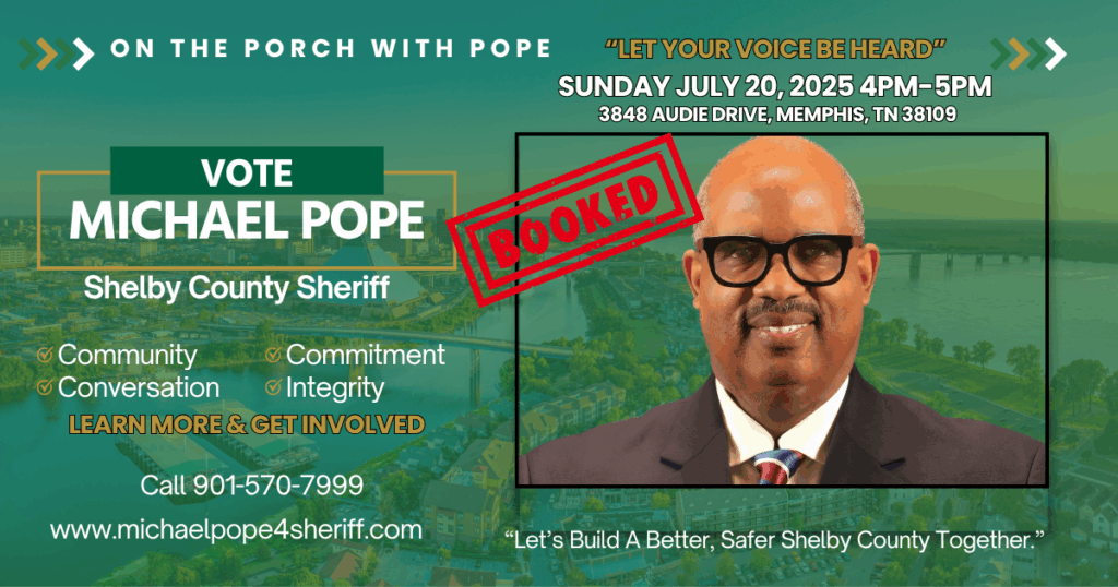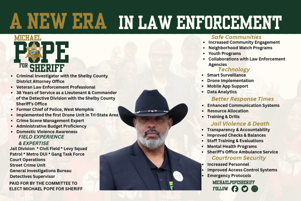 crack down on violent crime across Shelby County, stop the deaths and violence inside 201 Poplar, put deputies back on the street, and hold the sheriff’s office accountable with monthly public reports on crime, response times, and jail safety.